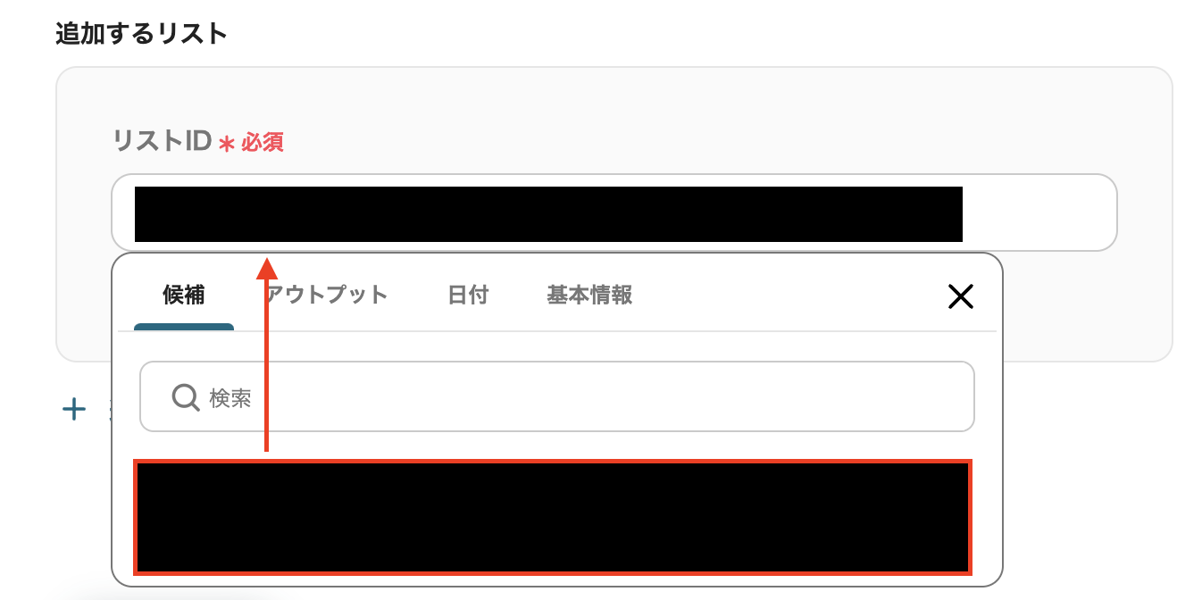 (4)「追加するリスト」の『リストID』は、入力バーをクリックすると、連携したアカウント内容をもとに、情報が「候補」に展開されます。