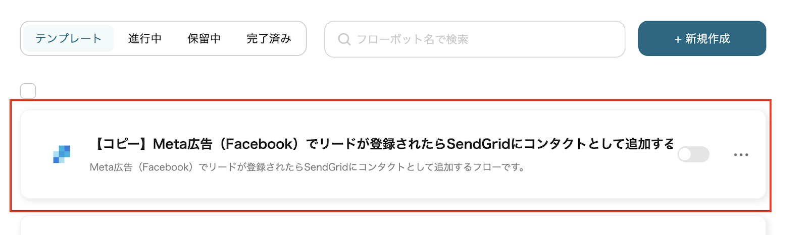 では、「Meta広告(Facebook)でリードが登録されたらSendGridにコンタクトとして追加する」のテンプレートを使ったフローボットを作成していきましょう。