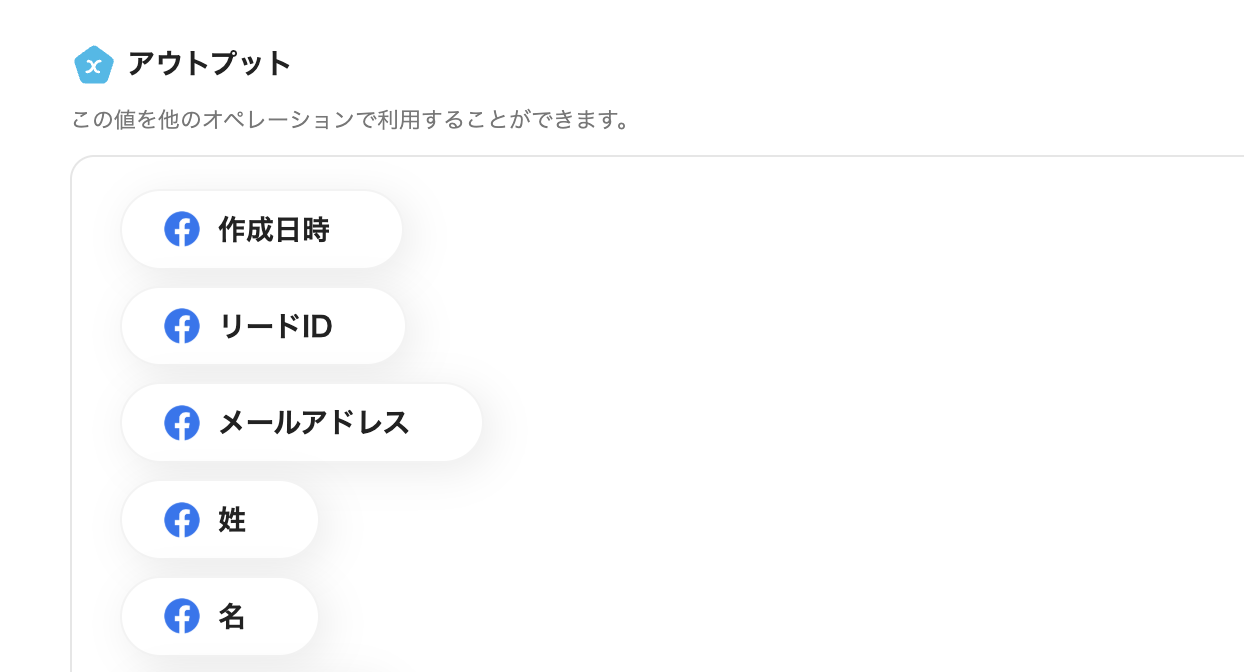 アウトプット情報は、「この値を他のオペレーションで利用することができます。」という注釈の通り、この後のステップで引用・活用できます。