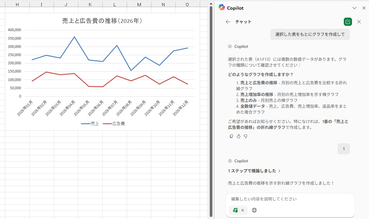 さらに、集計作業で手間がかかるピボットテーブルやグラフの作成も対応しています。 以前のCopilotはユーザーへの「提案」や「数式の提示」までが限界でしたが、現在はAIが「実際の編集作業」を直接実行する自律型エージェントへと進化 を遂げています。 単にグラフを生成するだけでなく、表記ゆれのあるデータに対する「データクレンジング(汚れの自動修正)」 や、複数ステップにわたる複雑なデータの整形作業までも、AIが自律的に代行してくれます。「選択した表をもとにグラフを作成して」 と話しかけるだけで、AIが自ら手順を考えてスプレッドシート上で直接処理を実行するため、資料作成のスピードが格段に上がります。