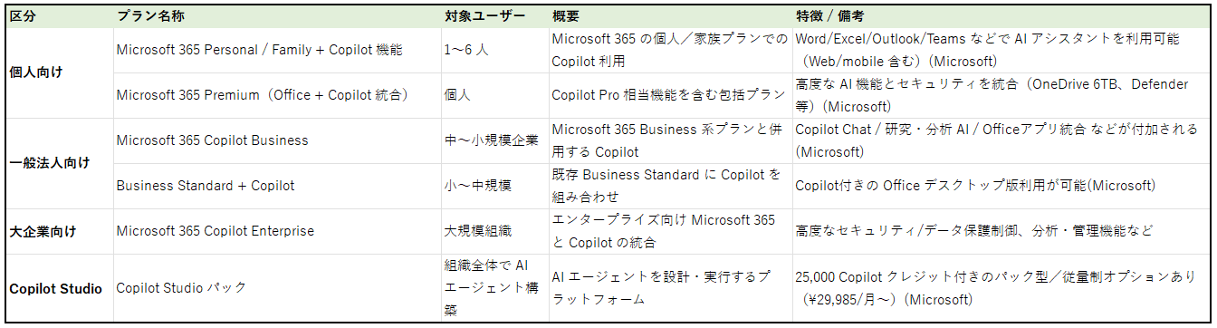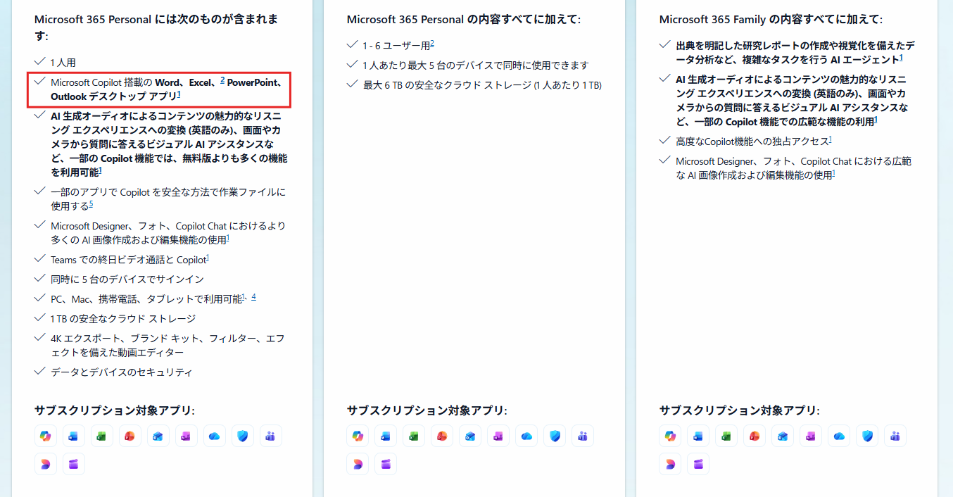 Microsoft CopilotをWordやExcelで本格的に活用するためには、サブスクリプションへの加入が必要となり、用途に応じた適切な料金プランを選択する必要があります。 下記のように「Word、Excel、PowerPoint、Outlook、Microsoft Teams などのアプリ内の Microsoft 365 Copilot」が提供されているプランであれば問題なくWord,ExcelにてCopilotを使用することができます。 最新の情報はこちらの公式サイト よりご確認ください。