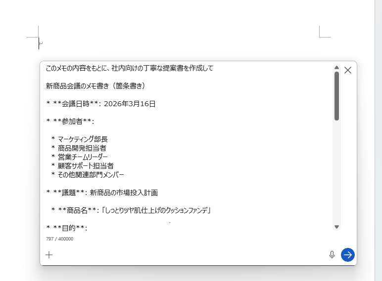 プロンプト入力欄に「以下のメモをもとに、社内向けのフォーマルな新規プロジェクト企画書のドラフトを作成してください」 と入力します。