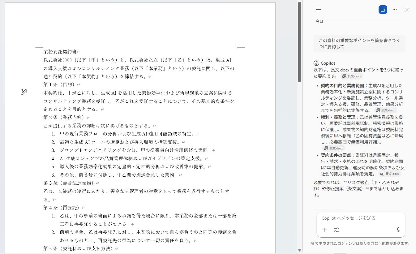 さらに、外部から共有された長文のマニュアルや契約書の確認作業でも大いに役立ちます。 文書全体を読み込む時間がない場合でも、「この資料の重要なポイントを箇条書きで3つに要約して」 と指示すれば、数秒で内容の骨格を把握できます。