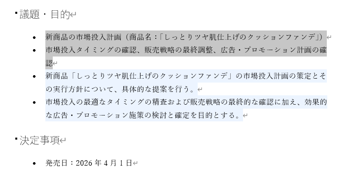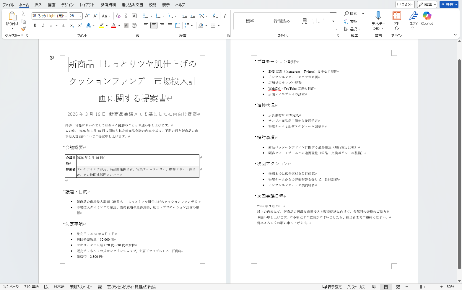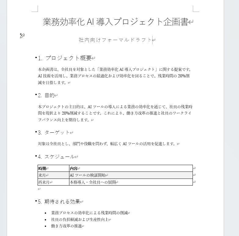 指示を出してからわずか数秒で、Copilotがドキュメント上に文章を自動生成し始めました。 箇条書きだった簡素な情報が補完され、「プロジェクト概要」「目的」「ターゲット」「スケジュール」、「期待される効果」といったビジネス文書として適切な見出しと段落が構成 されました。 言い回しも「~いたします。」「~を目指します。」といった、社内向けのフォーマルなトーンに調整されて出力されており、連携する内容をもっと充実させればそれだけで社内用の資料として使用していくことができそうです。