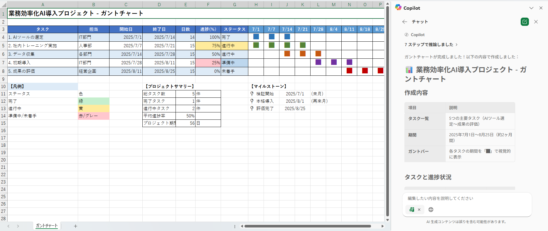Copilotに指示を送信すると、わずか数秒でExcel上に自動的にガントチャートが生成されました。 これらを手作業で作成しようと思うと、記載する項目を考えたり、体裁を整えたりと手間がかかってしまいますが、Copilotに指示を出せば数十秒で作成が完了します。