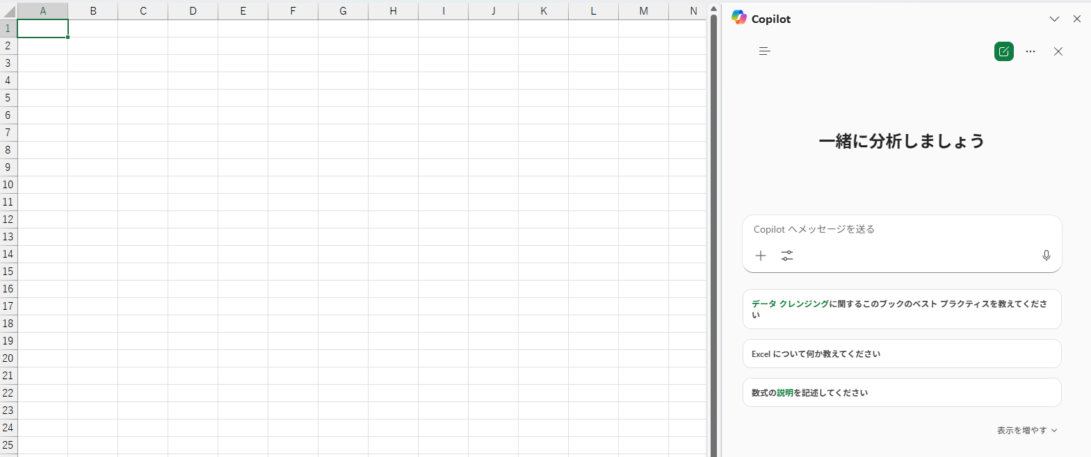 空白のExcelファイルを開き、Copilotのチャットウィンドウを開きます。
