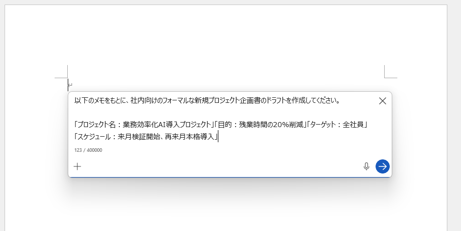 続けて、プロンプト内に「プロジェクト名:業務効率化AI導入プロジェクト」「目的:残業時間の20%削減」「ターゲット:全社員」「スケジュール:来月検証開始、再来月本格導入」 という簡素な箇条書きのメモを貼り付け、送信ボタンを押しました。