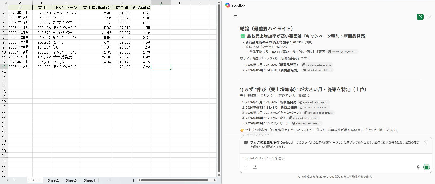 実務で非常に役立つのは、自然言語によるデータ分析とインサイトの抽出です。 例えば、月別の売上が並んだ表に対して「このデータから最も売上が伸びている要因を分析してハイライトして」 と指示すると、AIが自動的に傾向を読み取り、データの分析を行います。