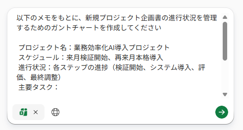プロンプト入力欄に「以下のメモをもとに、新規プロジェクト企画書の進行状況を管理するためのガントチャートを作成してください」 と入力します。