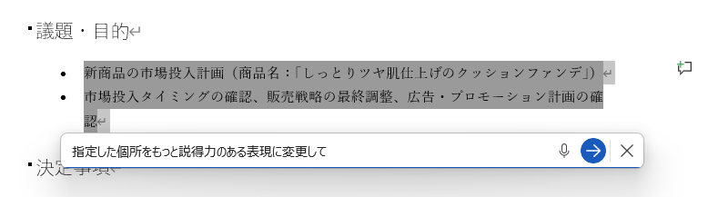 また、Wordのドキュメント上にある文章を直接指定し、修正過程を可視化しながらブラッシュアップすることも可能です。「指定した個所をもっと説得力のある表現に変更して」 と指示すれば、文脈を維持したまま的確なリライトを行ってくれるため、推敲作業が非常にスムーズに進みます。