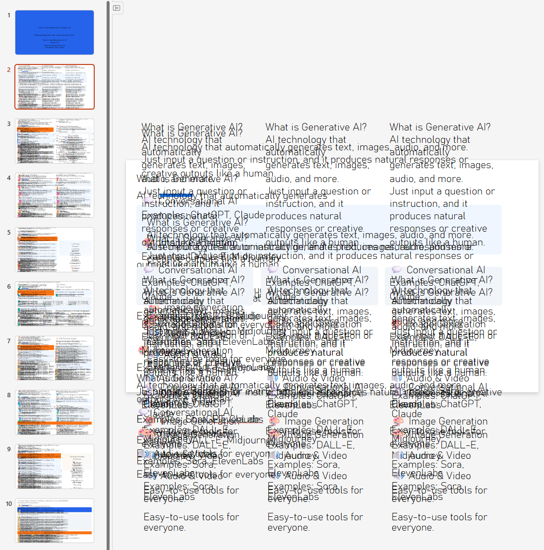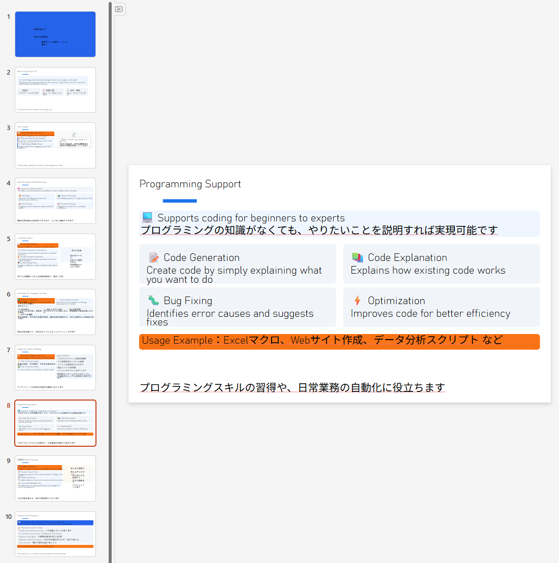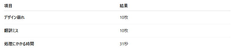処理時間は31秒と驚異的な速さでしたが、すべてのスライドでデザインが崩れ、未翻訳のテキストも残っていました。