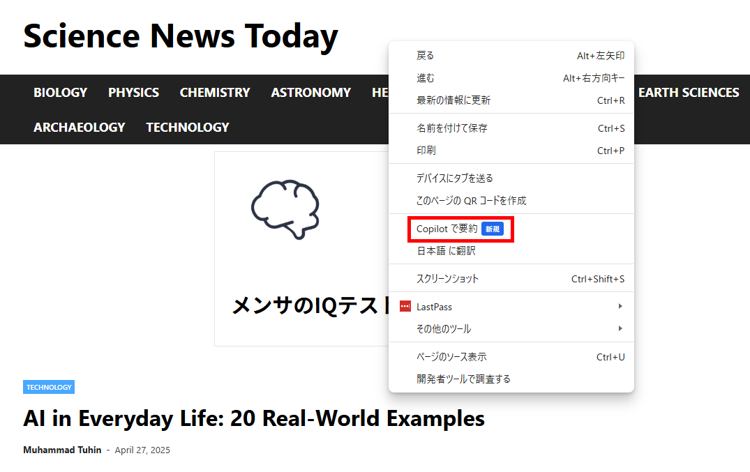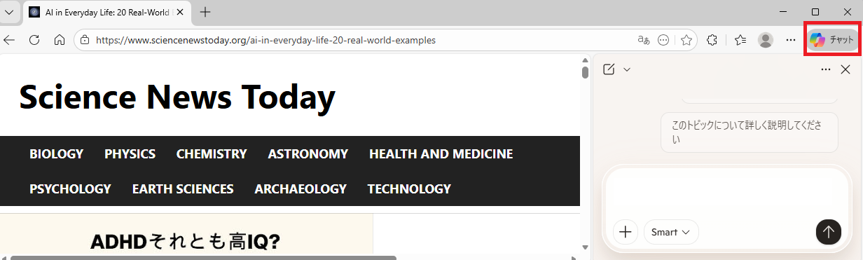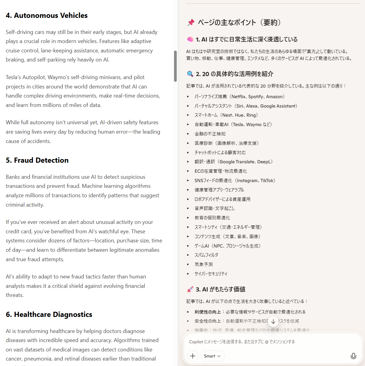 次に、Microsoft Edge上で海外のサイトを開き、別タブへのコピペをせずにその場で内容を要約・翻訳した結果です。