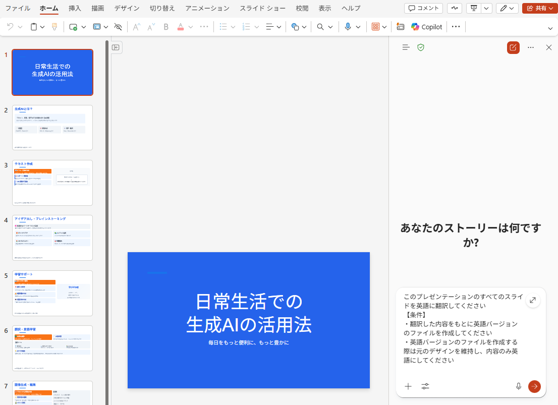 Copilotは、Microsoft製品との相性が良いことが最大のメリットですが、デザインを維持した翻訳版の資料作成ができないのであれば、優位性は限られます。