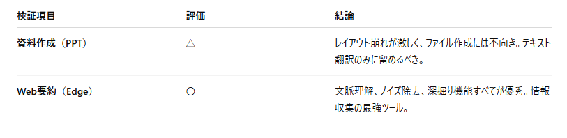 デザインが関わるPowerPointなどの資料作成では「テキストの翻訳」に限定して利用し、リサーチ業務ではEdgeのMicrosoft Copilotをフル活用するのが、現時点で最も効率的な使い方になります。