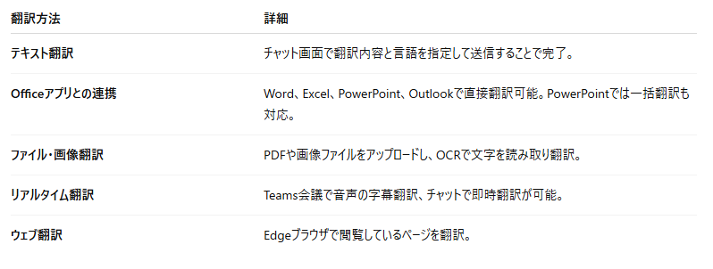 まずは、Microsoft Copilotが活躍する翻訳業務を一覧でご紹介します。