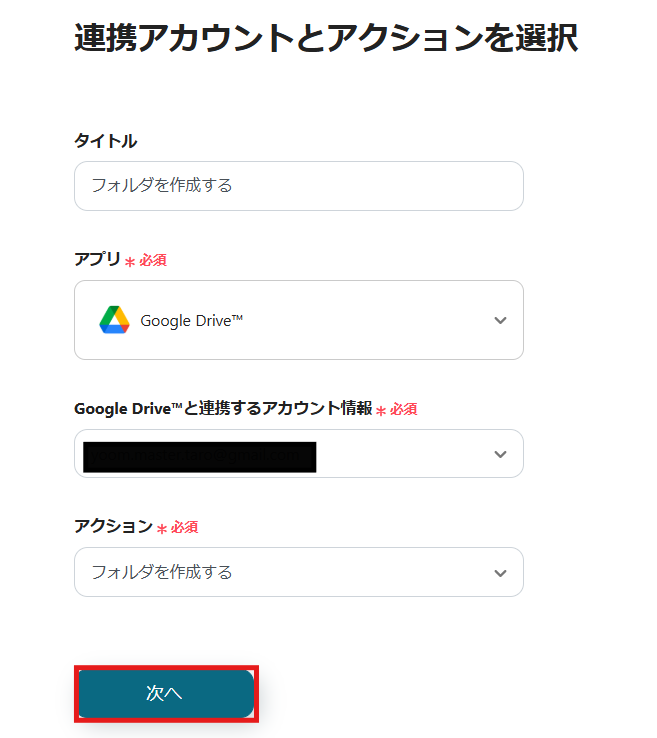 2) アクションは「フォルダを作成する」を選択してデータベースIDを入力し、「次へ」をクリックします。
