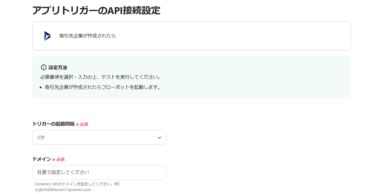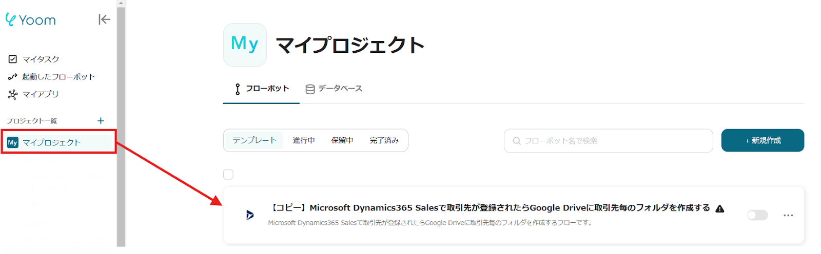 ここからは、Yoomのテンプレート【Microsoft Dynamics 365 Salesで取引先が登録されたらGoogle Driveに取引先毎のフォルダを作成する】という連携フローを使って設定をしていきます。