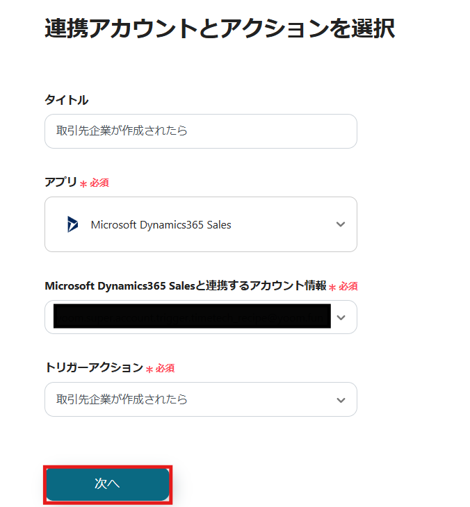 1) アクションは「取引先企業が作成されたら」を選択して、「次へ」をクリックします。