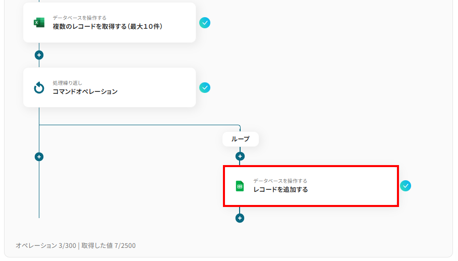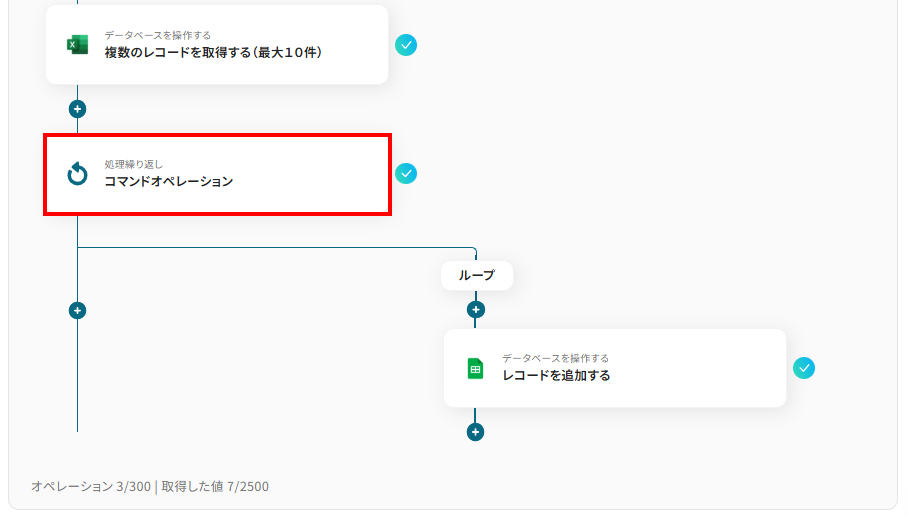 1.つぎに、先ほどの処理を繰り返し行うための設定を行います。 まずは、下記の赤枠をクリックしてください。 ※「同じ処理を繰り返す」オペレーションを使う場合は、チームプランまたはサクセスプランが必要です。フリープラン・ミニプランだと、そのオペレーションやデータコネクトを設定してもエラーになってしまうのでご注意ください。 ※チームプランやサクセスプランなどの有料プランには、2週間の無料トライアルがついています。トライアル期間中は、通常は制限されるアプリや機能(オペレーション)も問題なく使えるので、この機会にぜひお試しくださいね。