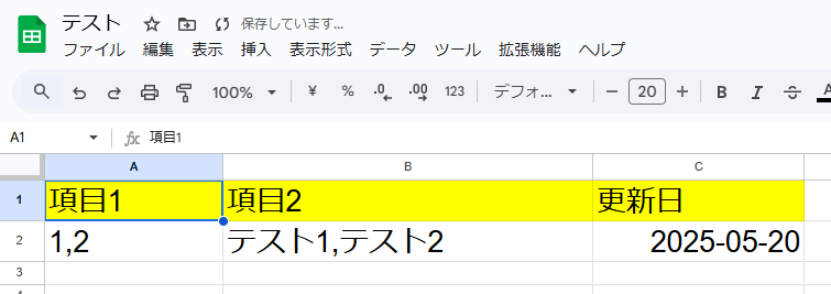 入力が完了したら、「テスト」を実行し成功するか確認してください。 指定したGoogle スプレッドシートにデータが反映しているはずなので、チェックしてみましょう。下記のように、設定した通りのレコードが追加されていればOKです! 最後に、「保存する」を押して次のステップへ進みましょう。