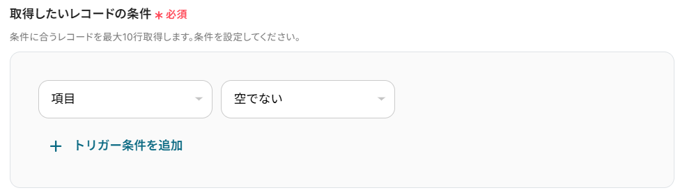 3.ここでは、先ほど指定したMicrosoft Excelからどのレコードを取得するのか設定していきます。 「取得したいレコードの条件」には、具体的にどのレコードを取得したいのか条件を設定しましょう。条件の追加もできるのでお好みでカスタマイズしてください。 今回は、全てのレコードを取得したいので下記のように設定しました。