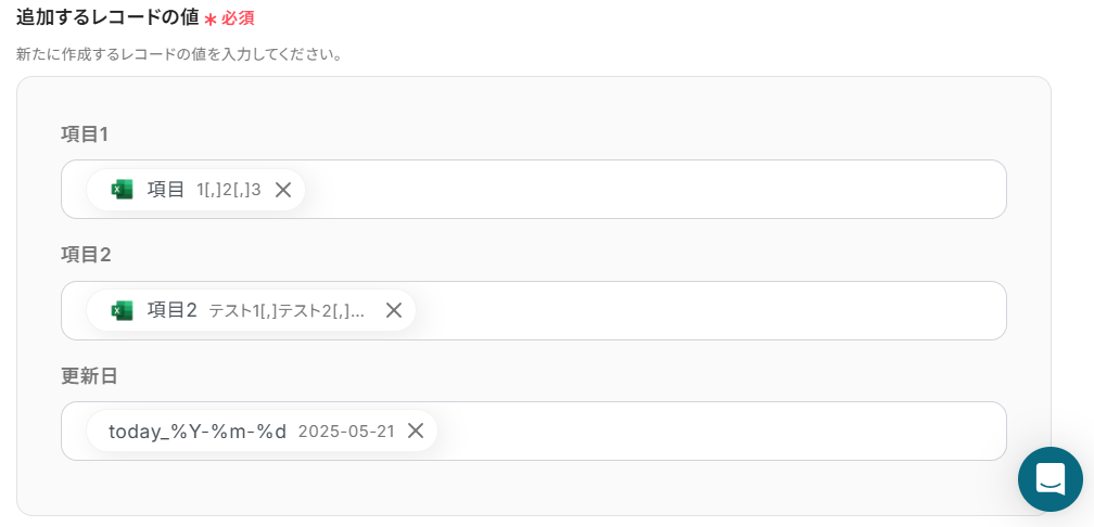 3.ここでは、Google スプレッドシートのどのレコードにデータを反映するか設定をします。 各入力欄をクリックすると、下記のようなアウトプットが表示されます。どのアウトプットを反映したいか、必要な情報を選択してください。 ※アウトプットについて詳しくはこちら をご覧ください。