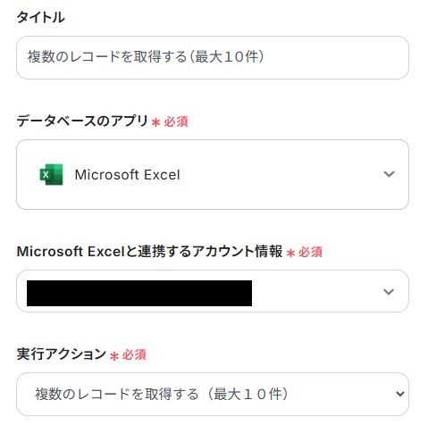 Microsoft Excelの準備ができたら、Yoom画面に戻りましょう。 タイトルとアカウント情報はステップ1で設定した内容が入力されています。なお、タイトルは任意でわかりやすい名前に変更可能です。 実行アクションは、テンプレート通りに「複数のレコードを取得する(最大10件)」のままで大丈夫です。