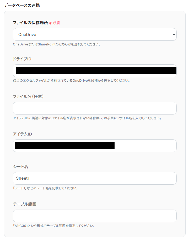 アイテムID:こちらも入力欄をクリックして、先ほど作成したMicrosoft Excelのファイル名を選択しましょう。