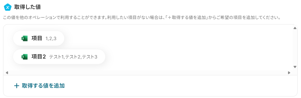 入力が完了したら、「テスト」を実行してみましょう。 成功すると、下記のようなMicrosoft Excelのレコードが反映したアウトプットが表示されます。 先ほど条件で設定したレコードが取得できていればOKです! 最後に、「保存する」を押して次のステップへ進みましょう。