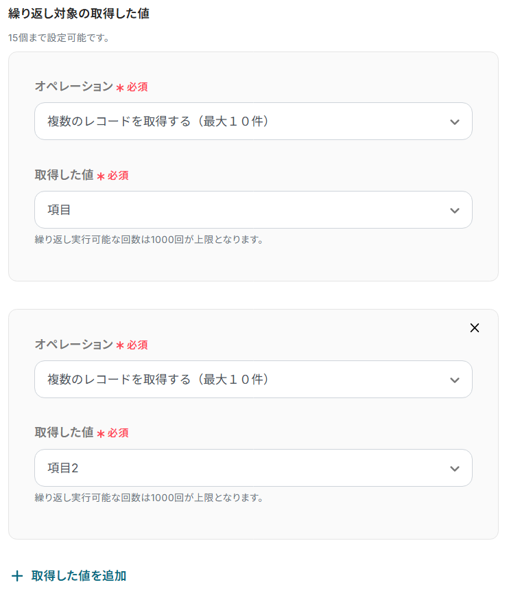 2.ここでは、繰り返しの対象を設定しましょう。 「タイトル」は、分かりやすいものに修正してもOKです。 「繰り返し対象の取得した値」には、任意の設定が可能なので、プルダウンから運用状況に沿った内容を選択しましょう。 対象のアウトプットを増やしたい場合には、『+アウトプットを追加』をクリックすると設定項目を増やせます。 今回は、下記のようにそれぞれの項目をアウトプットに設定しました。
