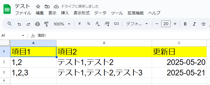 2.ここでは、レコードを追加したいGoogle スプレッドシートの設定を行います。 まだ、Google スプレッドシートの準備をしていない場合はこのタイミングで作成してください。 今回は、下記のようなGoogle スプレッドシートを作成したので、こちらにレコードを更新したいと思います。
