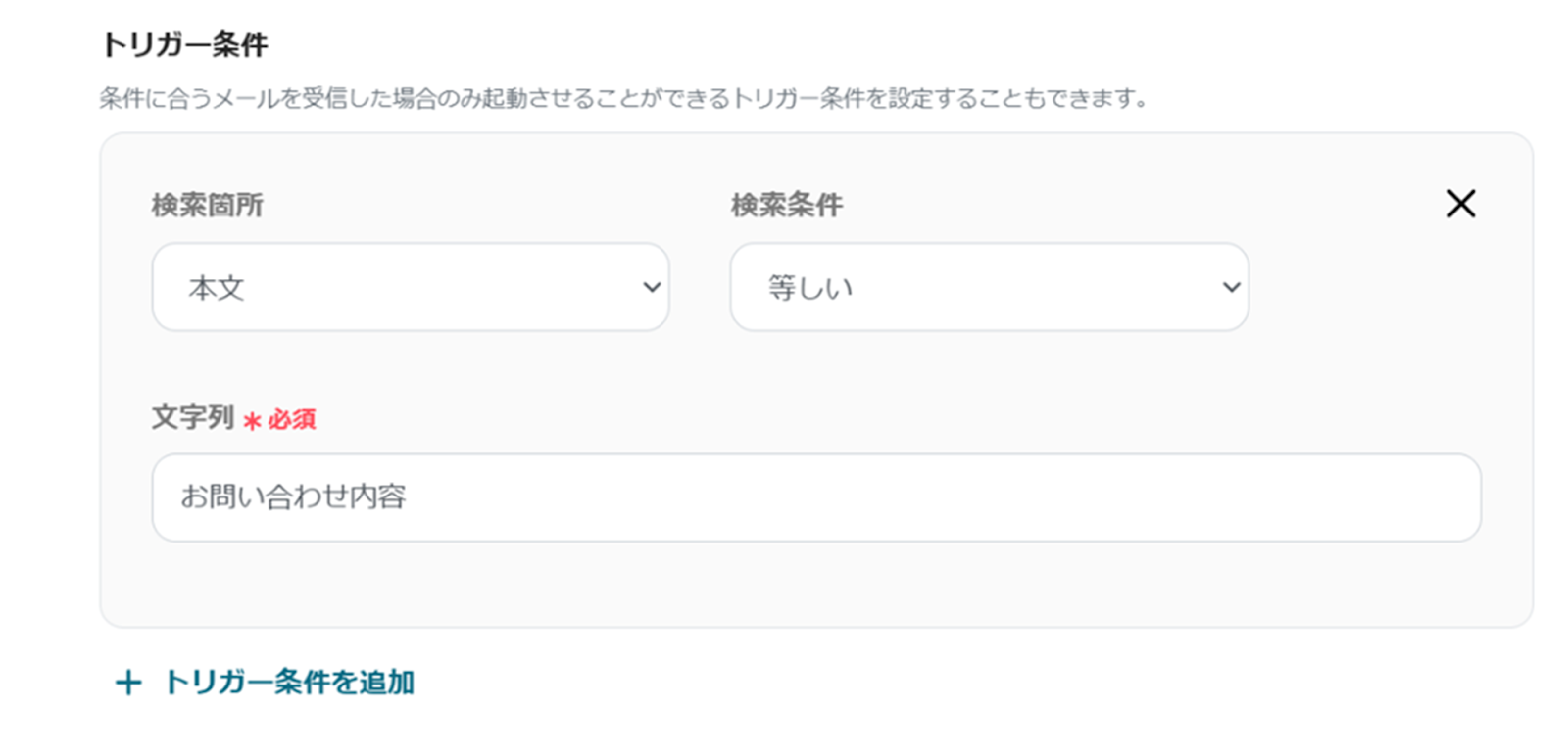 「+トリガー条件を追加」をクリックし、条件を設定します。