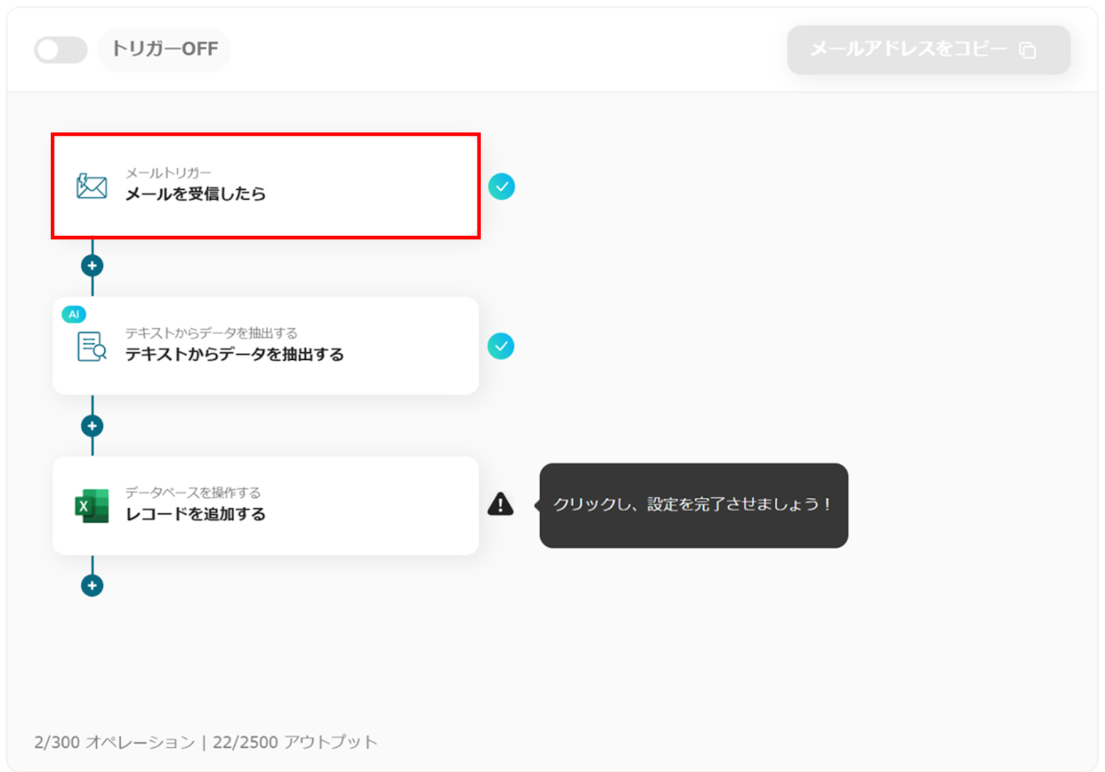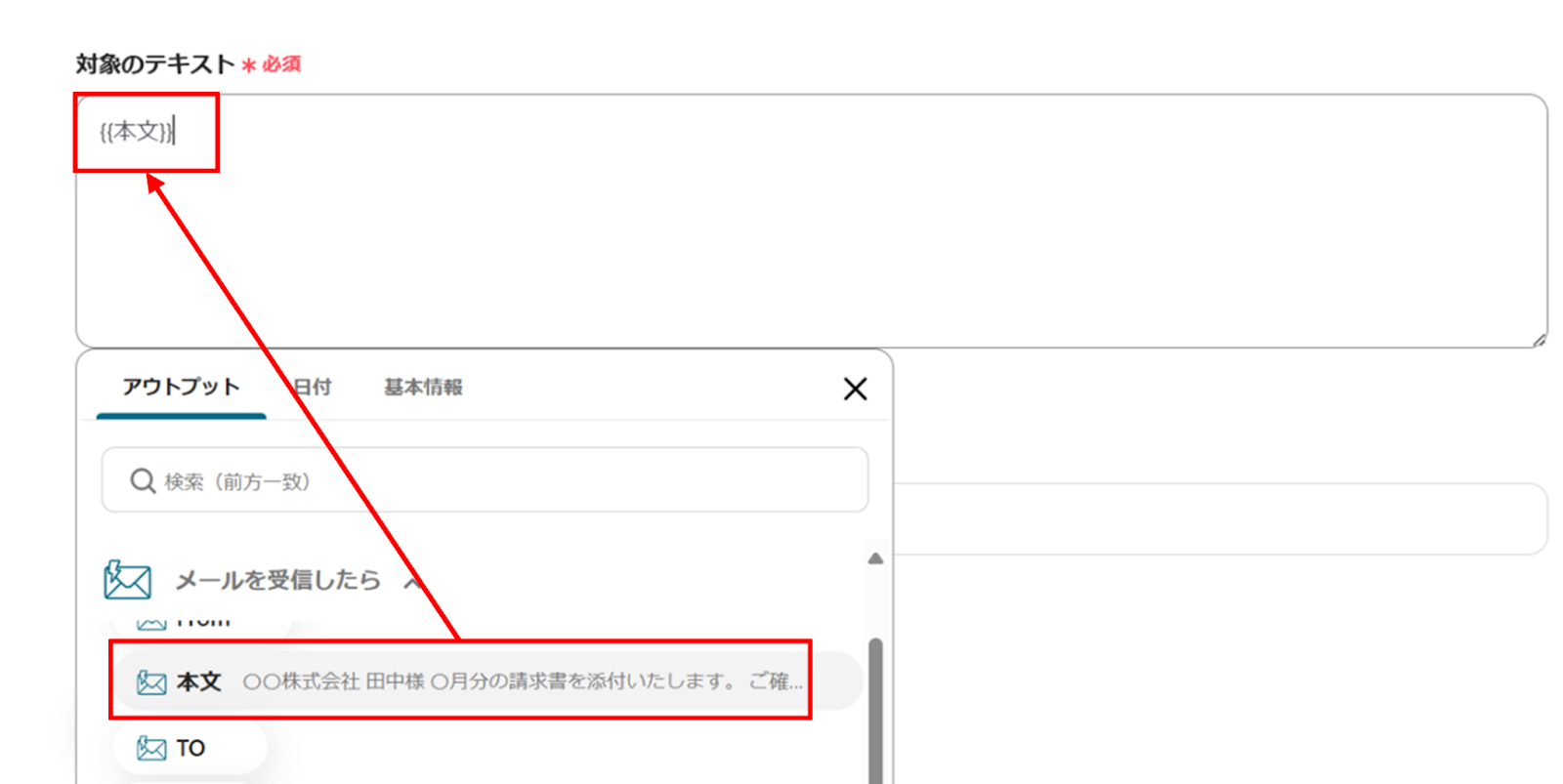アウトプットから選択することでメールトリガーの情報を引用することができます。