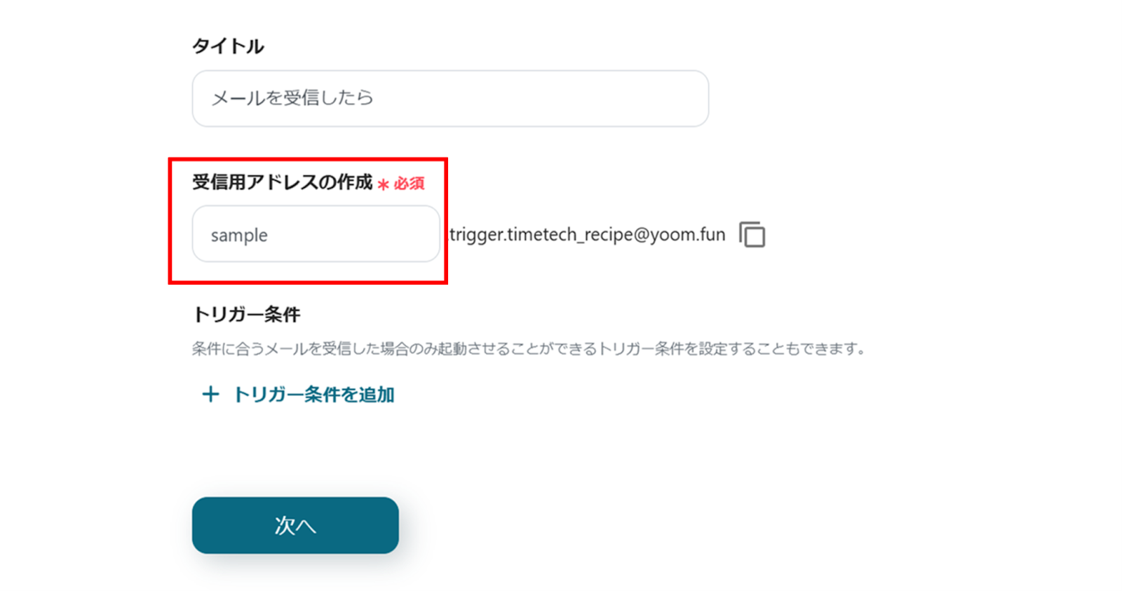 (2)「メールトリガーの条件設定」画面から、赤枠に任意の文字列を入力し、メールアドレスを作ります。