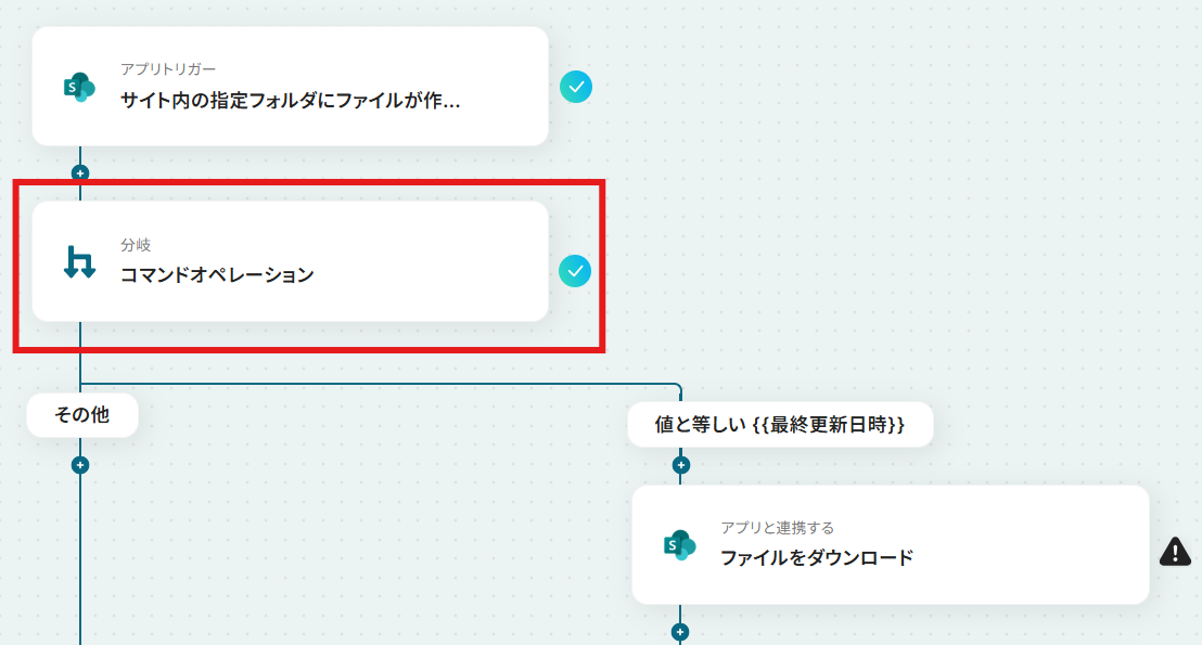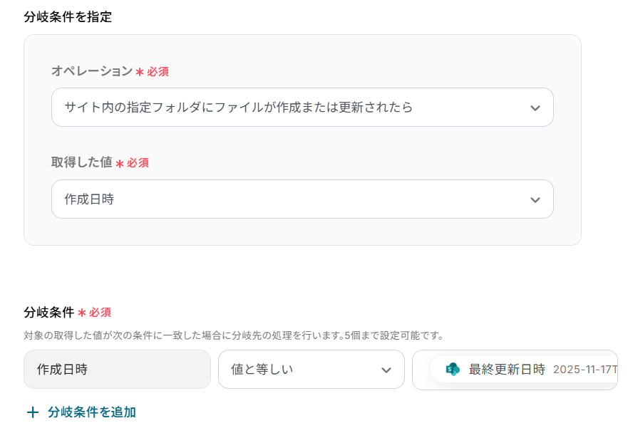 分岐機能では、Trelloのカード情報(リスト名、ラベル名など)をもとに、フォルダを作成する条件を任意に設定できます Microsoft SharePointでフォルダを作成する際に、フォルダ名にTrelloのカード名を設定するなど、固定値や前のステップで取得した情報を活用して柔軟な設定が可能です ■注意事項