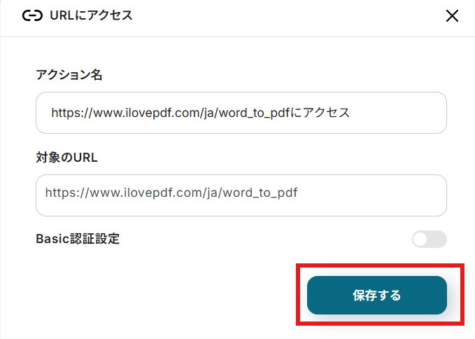 今回は操作例として、iLovePDFを使用しています。用途や社内ルールなどに応じてURLをカスタマイズして使ってください。 設定できたら「保存する」を選択します。