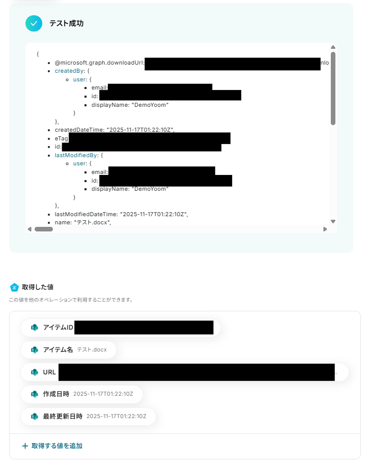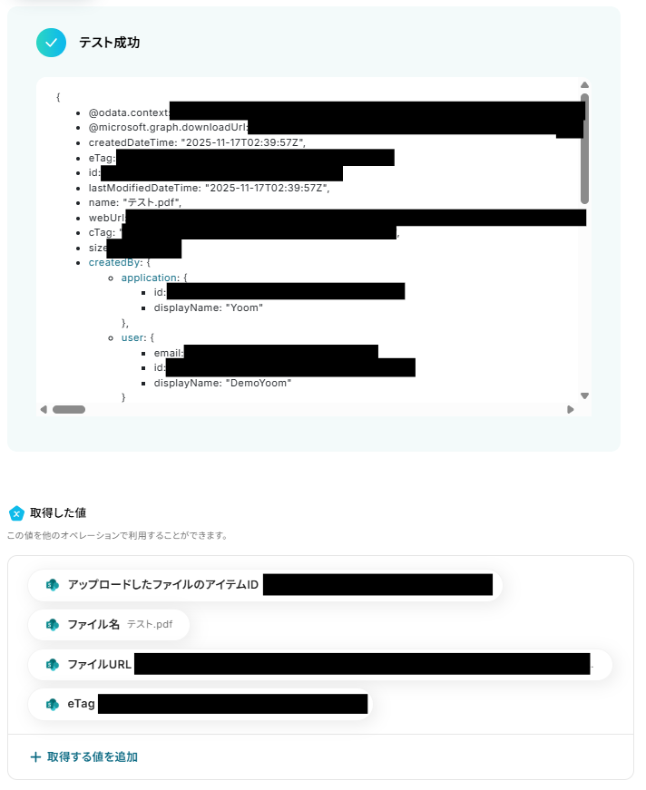 ※取得した値 とは? トリガーやオペレーション設定時に、「テスト」を実行して取得した値のことを指します。 後続のオペレーション設定時の値として利用でき、フローボットを起動する度に変動した値となります。