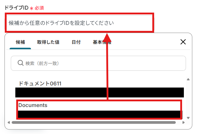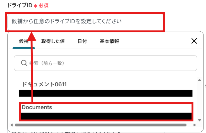 Microsoft SharePointでファイルをアップロードしたい「サイトID」・「ドライブID」・「格納先フォルダのアイテムID」を候補から選択しましょう。