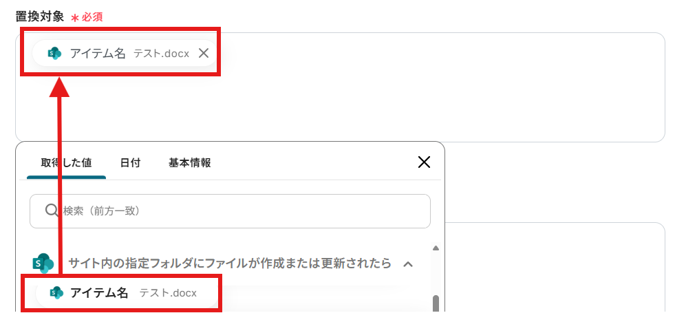 「置換対象」を「取得した値」から設定しましょう。