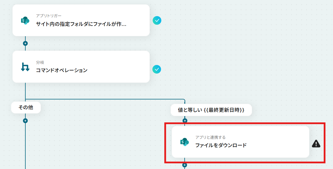 Microsoft SharePointのトリガー設定では、通知の起点としたいサイトIDやフォルダIDを任意で設定してください 分岐機能では、前のステップで取得したファイル名や拡張子などの情報をもとに、後続のオペレーションを分岐させるための条件を任意で設定できます Microsoft SharePointのオペレーションでは、固定値や前のステップで取得した情報を変数として利用し、ダウンロード対象のファイルを指定できます Notionの各オペレーションでは、固定値や前のステップで取得した情報を変数として利用し、ファイルをアップロードするページや更新するプロパティを任意で設定可能です ■注意事項