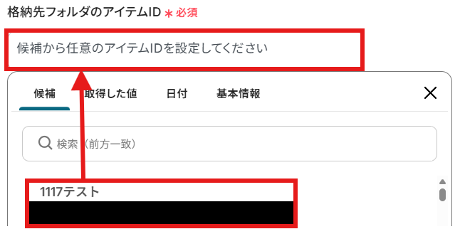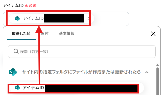 「アイテムID」を「取得した値」から設定しましょう。 取得した値は変数となります。固定値ではないため、トリガーが実行されるたびに取得した情報を反映できます。
