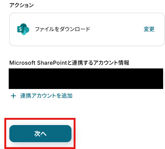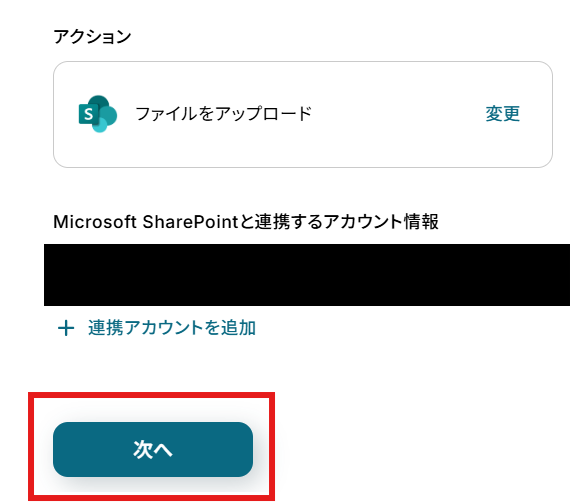 「アクション」はテンプレート通りのままでOKです! 「Microsoft SharePointと連携するアカウント情報」を確認し、「次へ」をクリックして進んでください。
