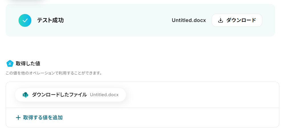 設定できたら「テスト」を行いましょう。 テストに成功すると、対象のファイルがダウンロードされます。 この時、ダウンロードされたファイルの名前は「Untitled」で固定されるため、正しいファイルであるかを確認する場合は「ダウンロード」をお試しください。 「完了」を選択しましょう。