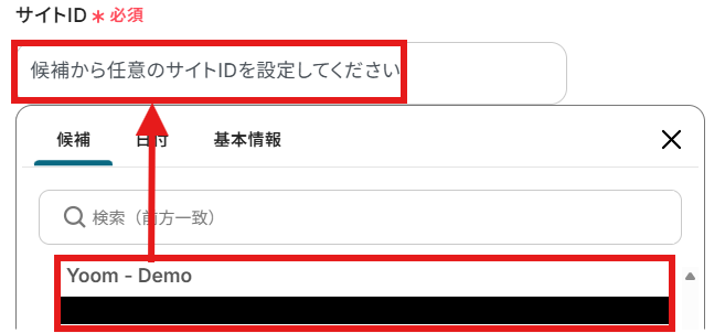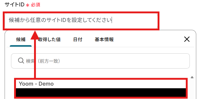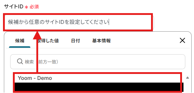Microsoft SharePointで使用したい「サイトID」と「フォルダID」を候補から選択しましょう。