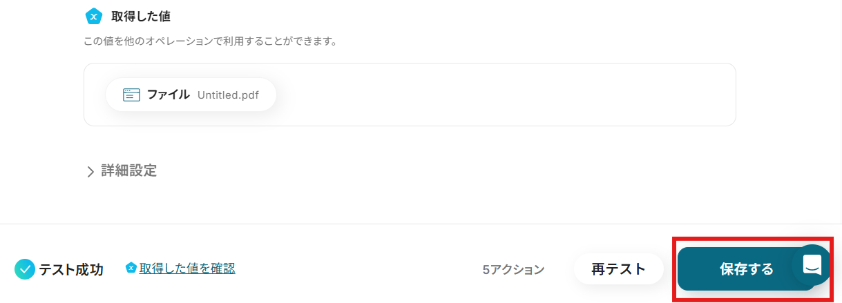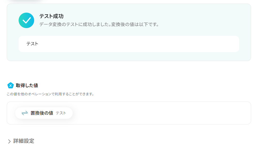 設定できたら「テスト」を行いましょう。 テストに成功すると「取得した値」に反映されます。詳しくは以下をご覧ください。
