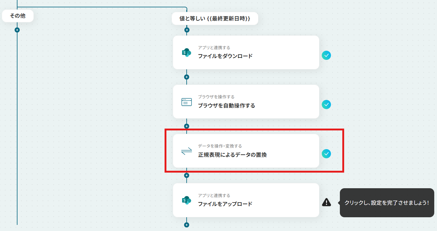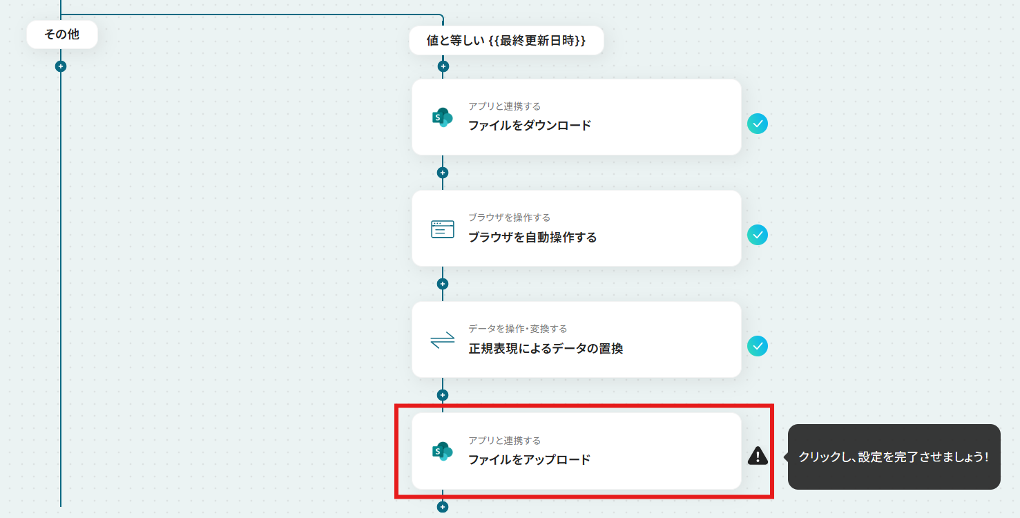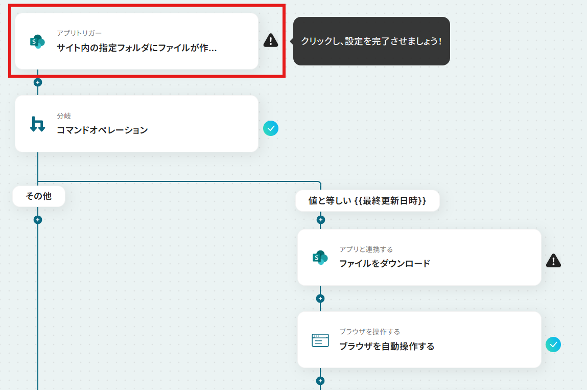 Microsoft SharePointのトリガー設定では、監視対象としたいサイトIDやフォルダIDを任意で設定してください。 分岐機能では、ファイル名などの情報をもとに、後続の処理を分岐させる条件を任意にカスタマイズできます。 RPA機能では、自動操作の対象とするWebページやクリックするボタン、入力するテキストなどを自由に設定可能です。 正規表現によるデータの抽出では、どのテキストから、どのようなパターンの情報を抽出するかを任意で設定できます。 ファイルをアップロードするMicrosoft SharePointのオペレーションでは、アップロード先のフォルダやファイル名などを、固定値や変数を用いて任意に設定可能です。 ■注意事項