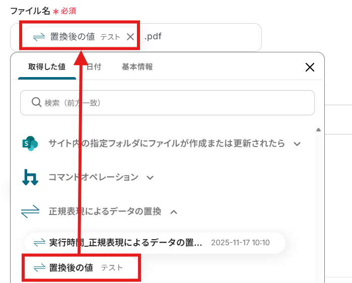 ファイル名に日付を入れる場合 例:「{{置換後の値}}{{日付}}.pdf」