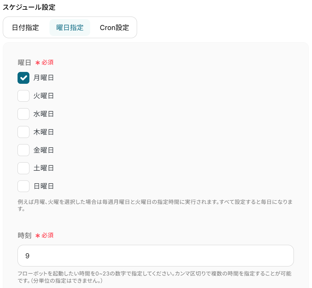曜日指定から、通知する曜日をクリックし、時刻は9時を設定しました。 曜日以外にも、日付やCron設定が可能です。
