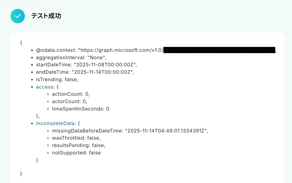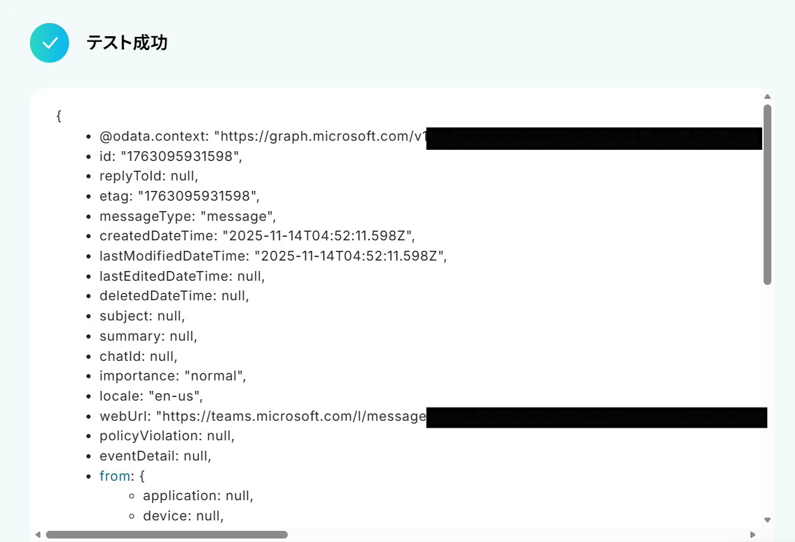 設定できたらテストし、成功したら保存しましょう。取得した値 はのちのフローで使用できます。