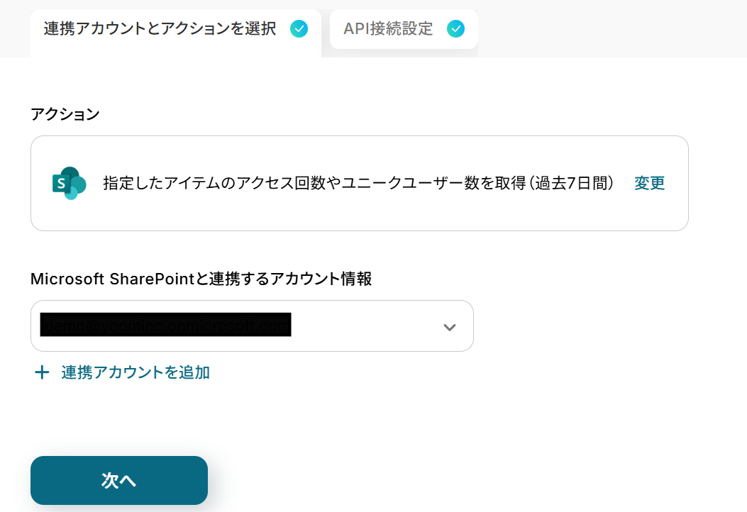 連携するアカウントを確認したら、アクションは変更せず「次へ」をクリックします。